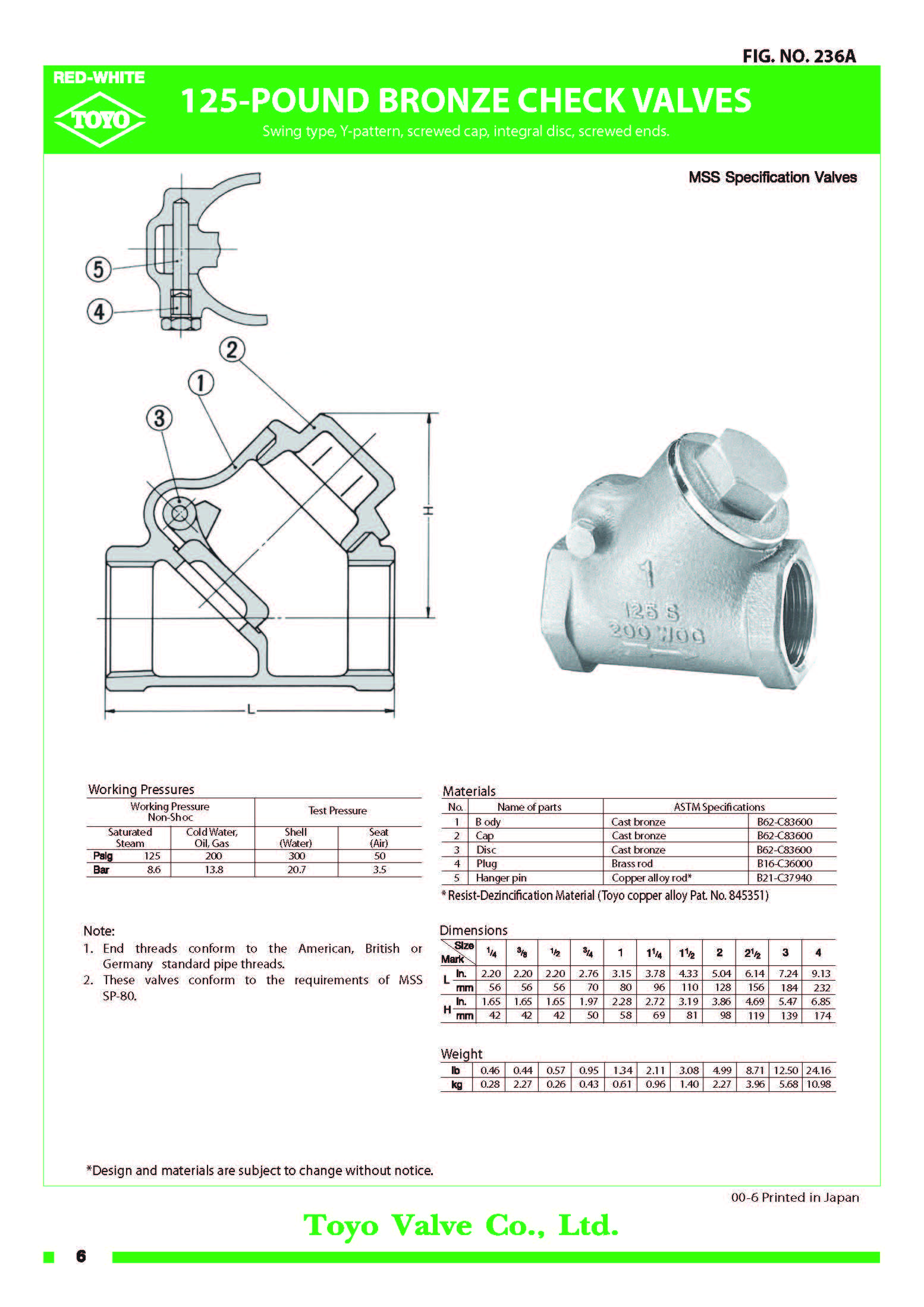 TOYO VALVES เช็ควาล์วทองเหลืองโตโย รุ่น 236A TOYO BRONZE CHECK VALVES 236A