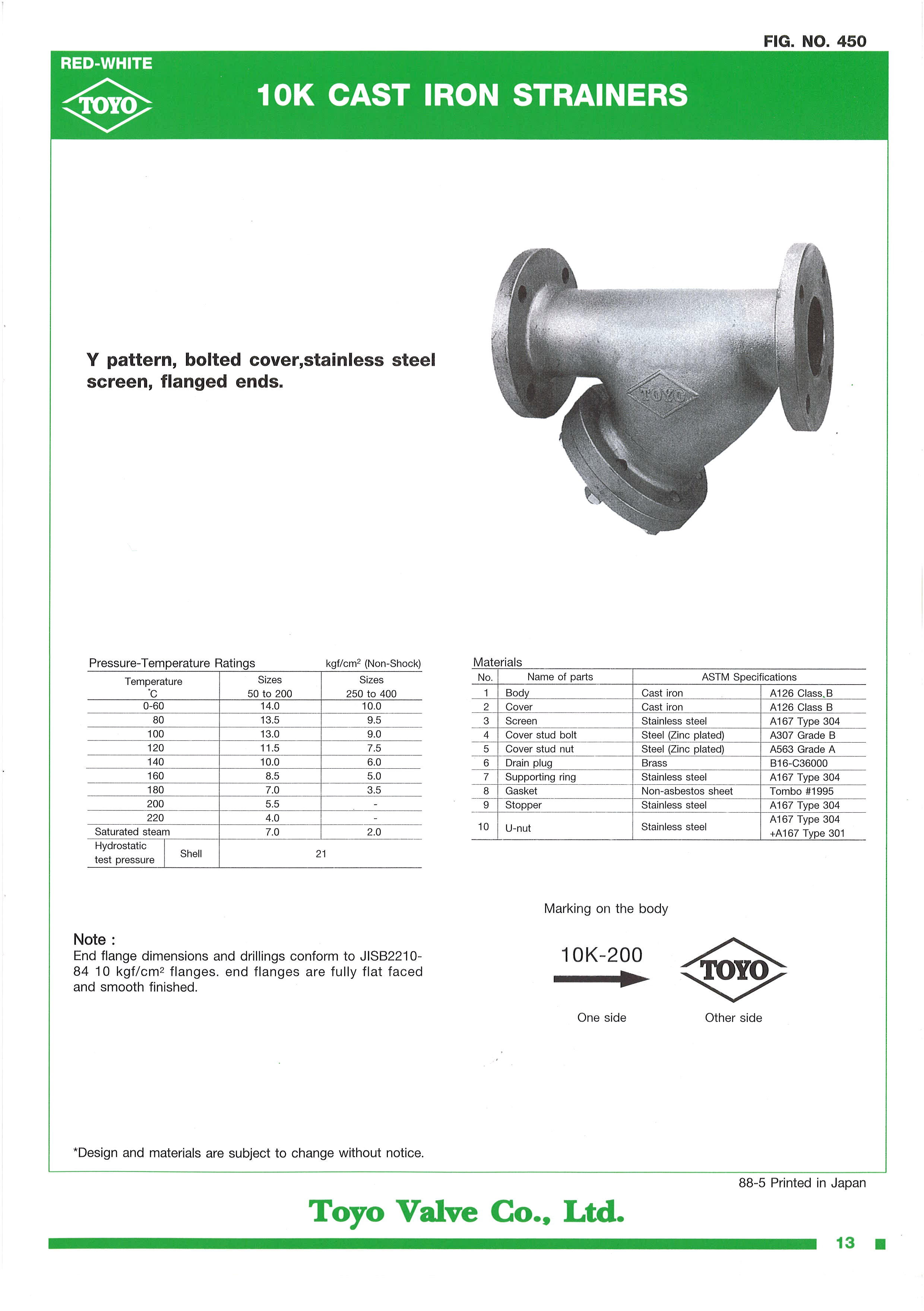 TOYO CAST IRON STRAINERS FLANGED VALVES 450AF / 10K